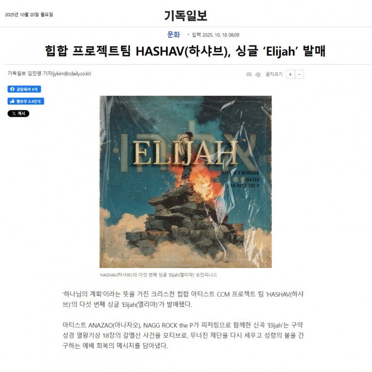 [기사] 힙합 프로젝트팀 HASHAV(하샤브), 싱글 ‘Elijah’ 발매(기독일보)